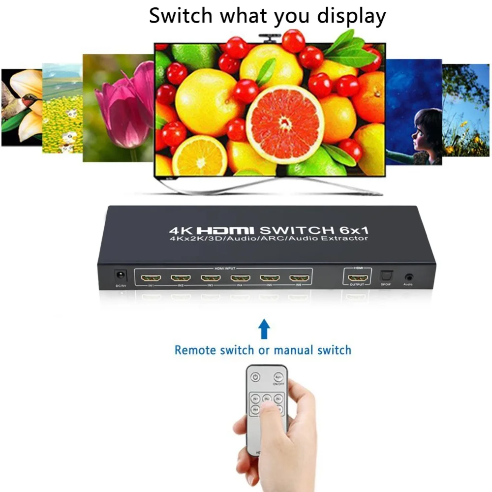 6 Port HDMI Switch with ARC Audio Extractor,HDMI Switch 6X1 4K HDMI Switcher 6 in 1 Out With IR Remote,Optical SPDIF 3.5mm Audio