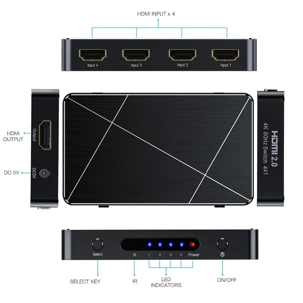 Good Price of 4x1 HDMI 2.0 Switch 4K 60Hz 4:4:4 HDR HDMI Switch 4 Port HDMI Selector 4K with Remote Control