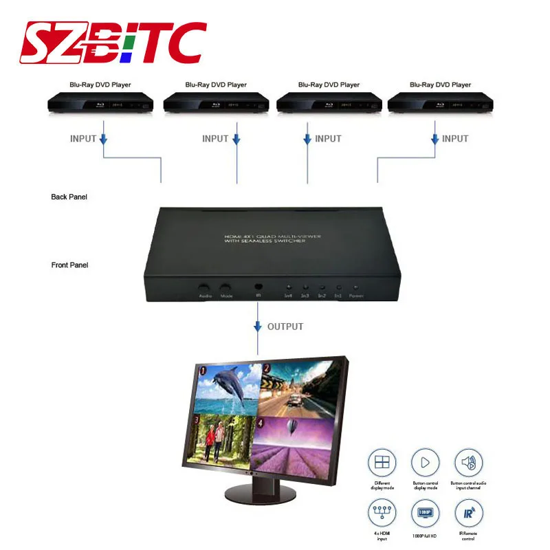 Related Product for SZBITC HDMI Switcher 4x1 Quad Multi-viewer With Seamless Switching HDMI Picture Division 4 With IR